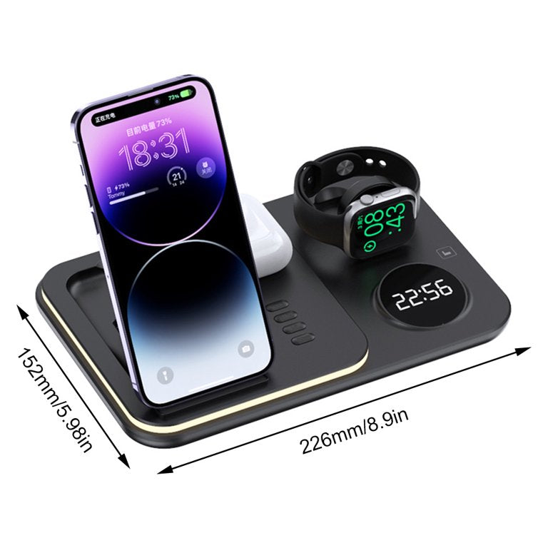 The sleek design features LED lights and a digital clock display, making it a stylish addition to any space. The dock is crafted with high-quality materials, ensuring durability and reliability. Say goodbye to tangled cables and cluttered desks, and embrace the convenience of the 5 in 1 Wireless Charging Station Dock - Model A82.
